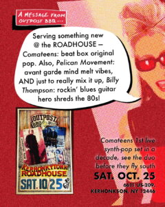 Join us at the Roadhouse for three diverse bands starting at 6:30 pm with Pelican Movement, a “fictitious supergroup” from New Paltz, followed by The Comateens from New York City, playing 80s beat box pop, and finally rock, soul, and blues musician Billy Thompson.